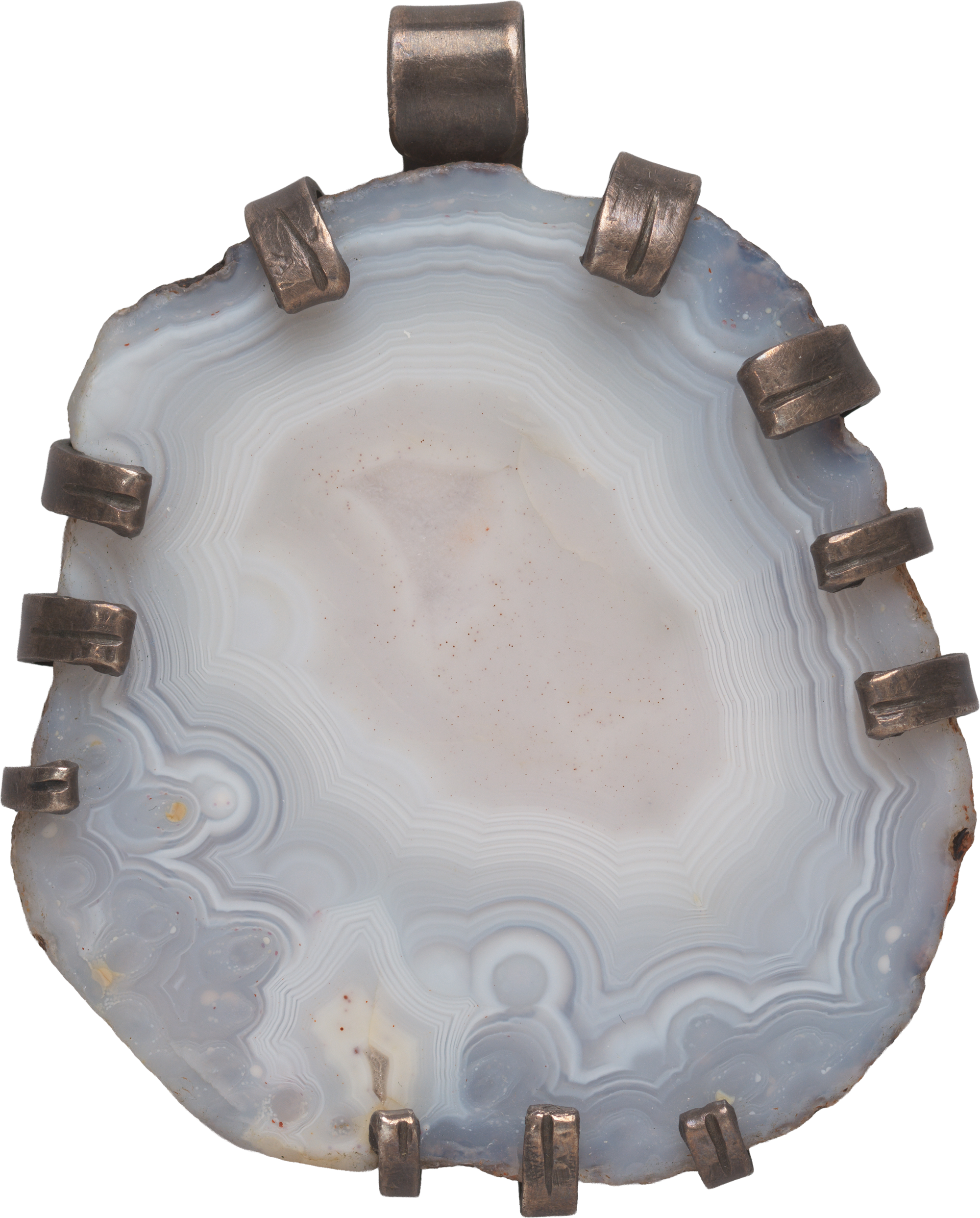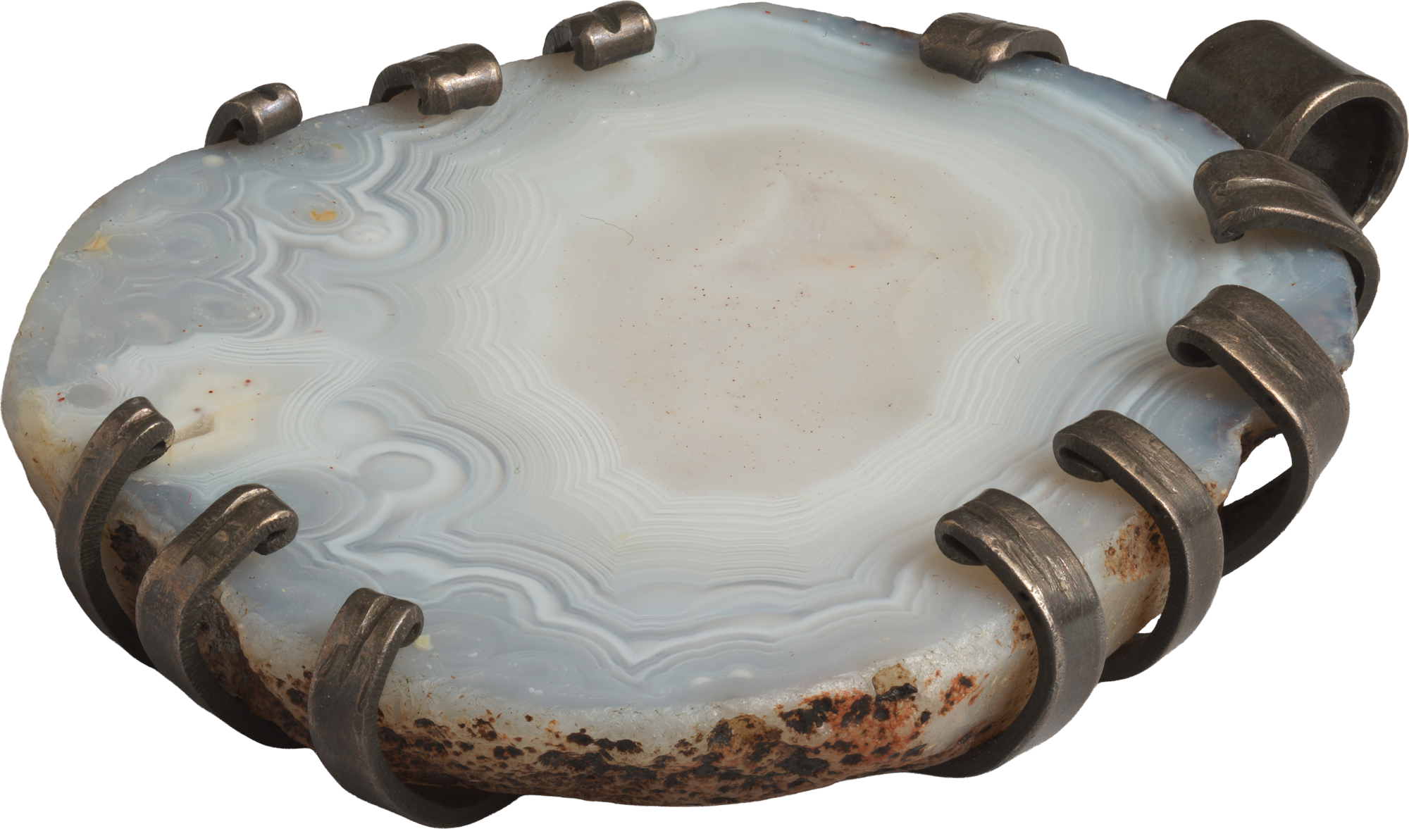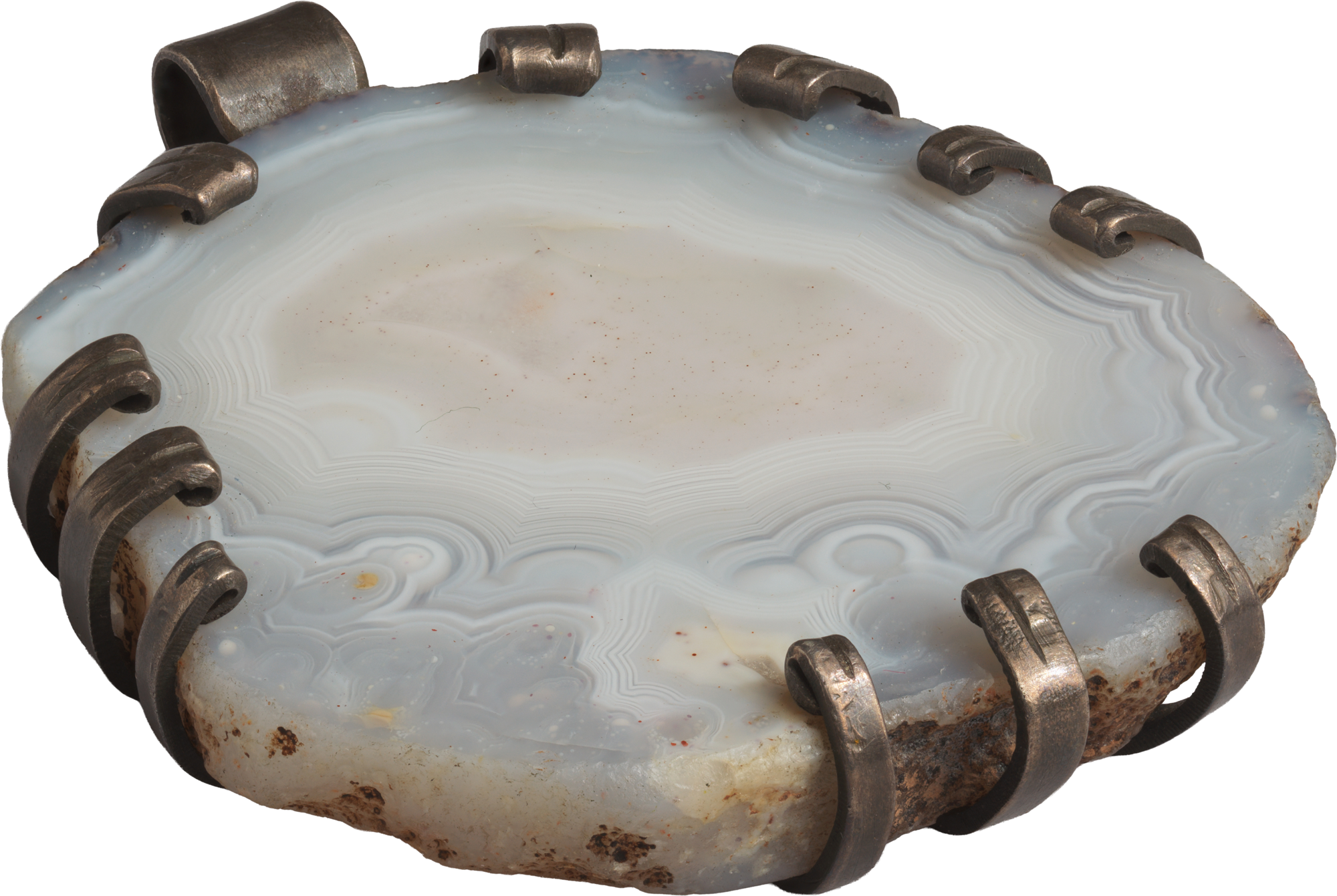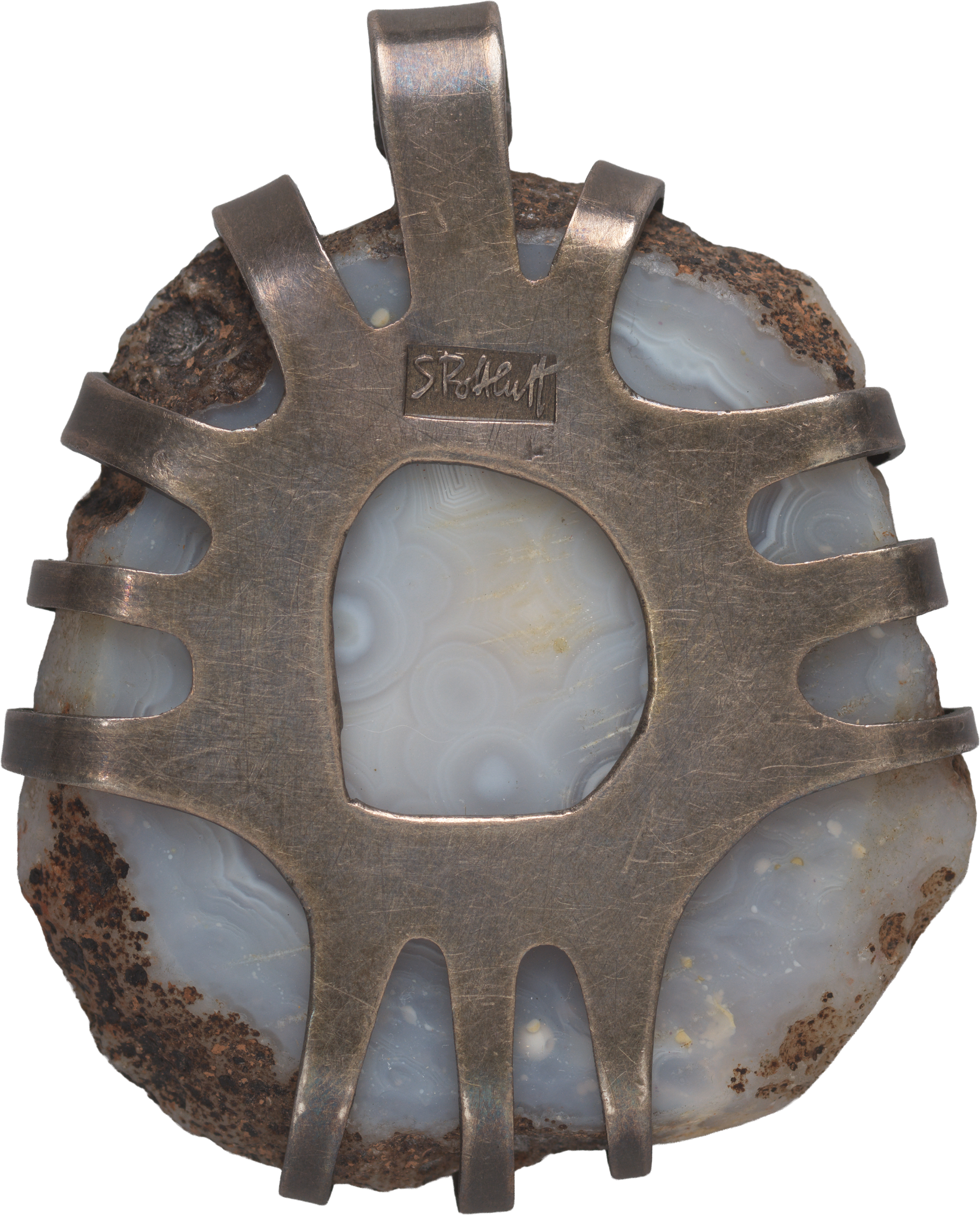 Karl Schmidt-Rottluff, Anhänger mit Achatscheibe, 1920er-Jahre, Achatscheibe, poliert, in Silberfassung, Bodenplatte zu Krallen und Bandlasche hochgebogen, Brücke-Museum, © VG Bild-Kunst, Bonn 2025
