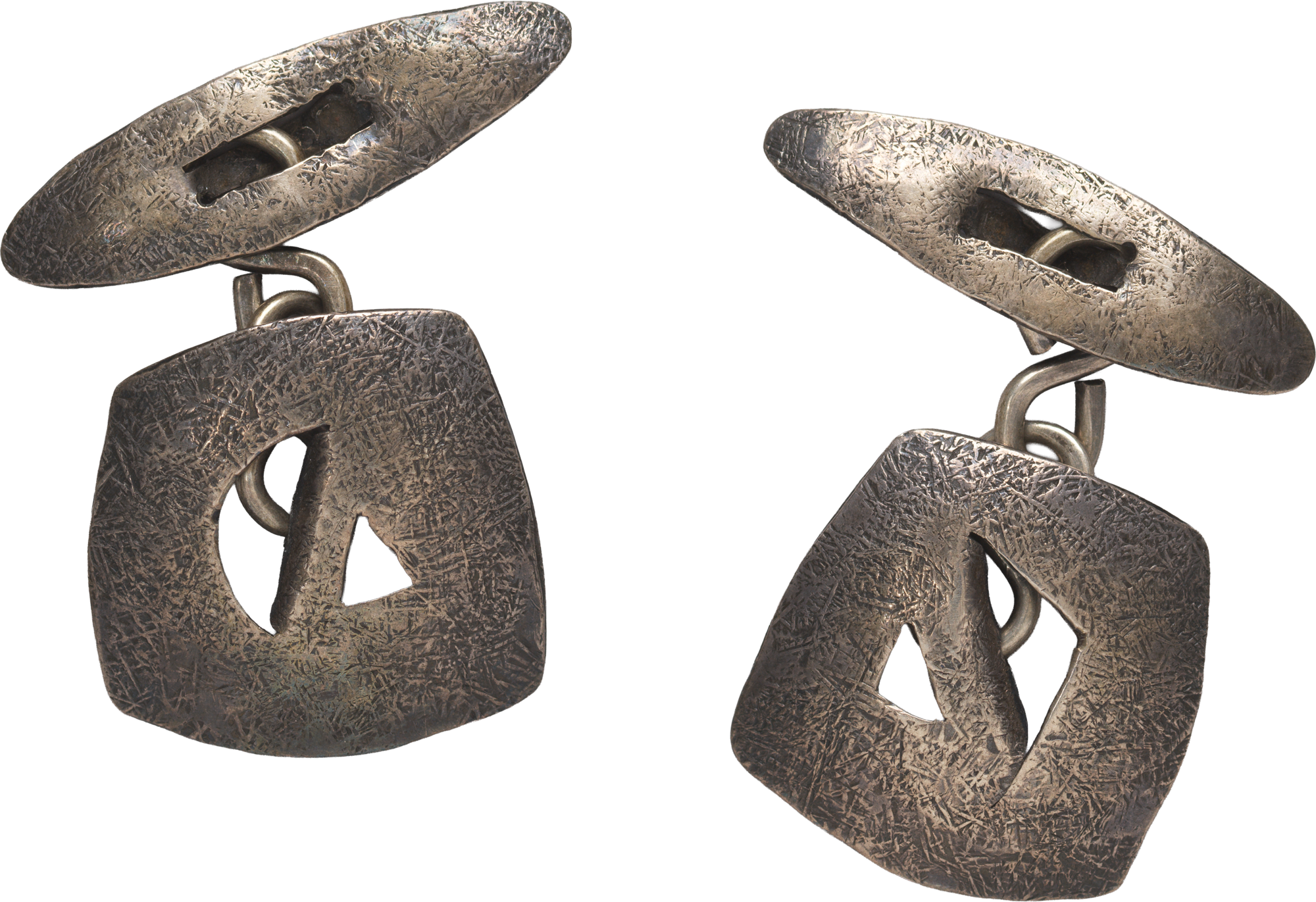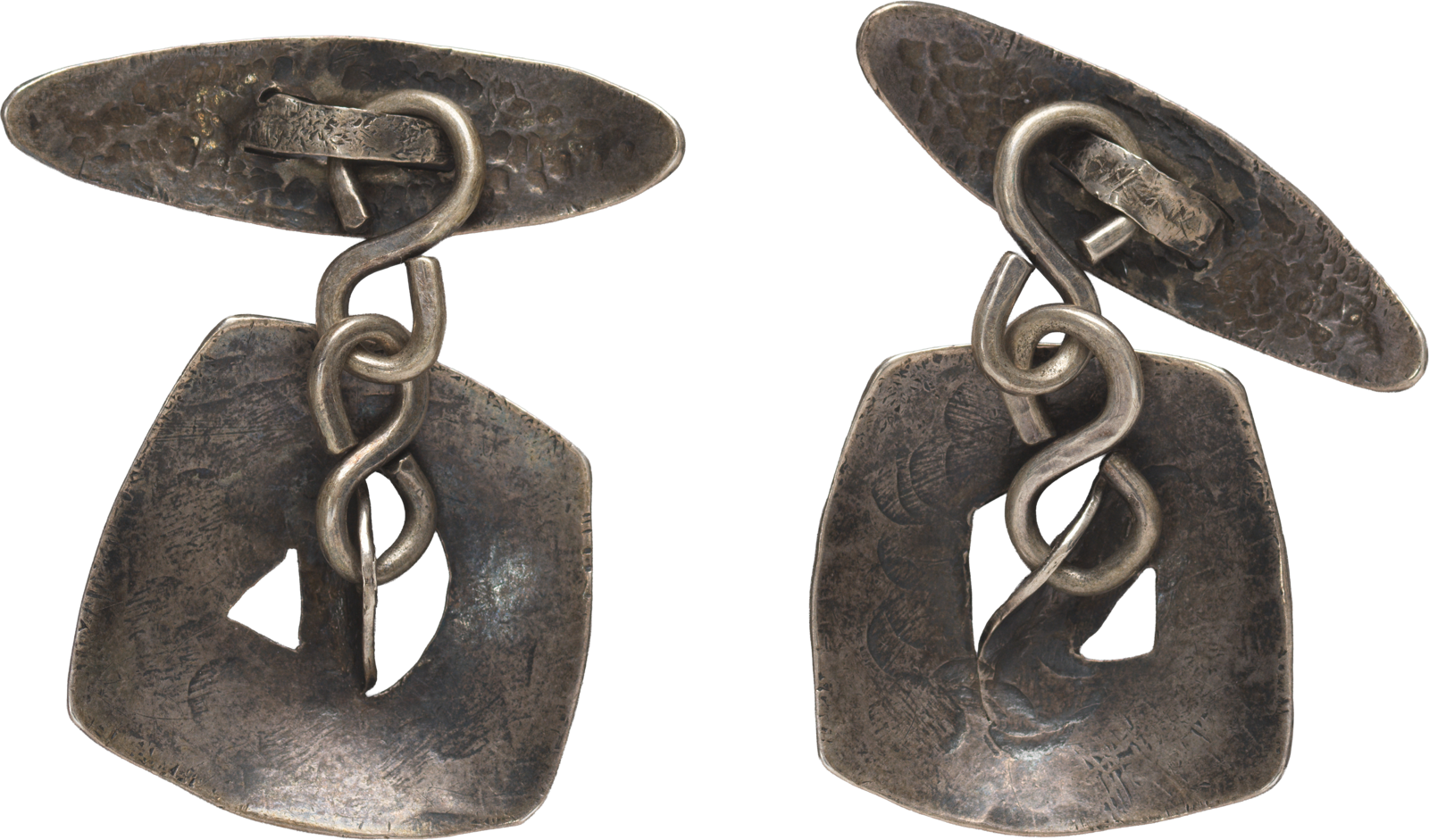 Karl Schmidt-Rottluff, Manschettenknöpfe, 1920er-Jahre, Silberblech, geschnitten und gehämmert, ziseliert, Teile durch Achterösen verbunden, Brücke-Museum, Karl und Emy Schmidt-Rottluff Stiftung, © VG Bild-Kunst, Bonn 2025